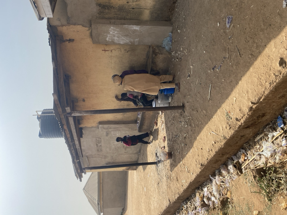 An outdoor scene in Gyellesu, Nigeria, depicts an unpaved, dusty ground area under a clear, bright sky
