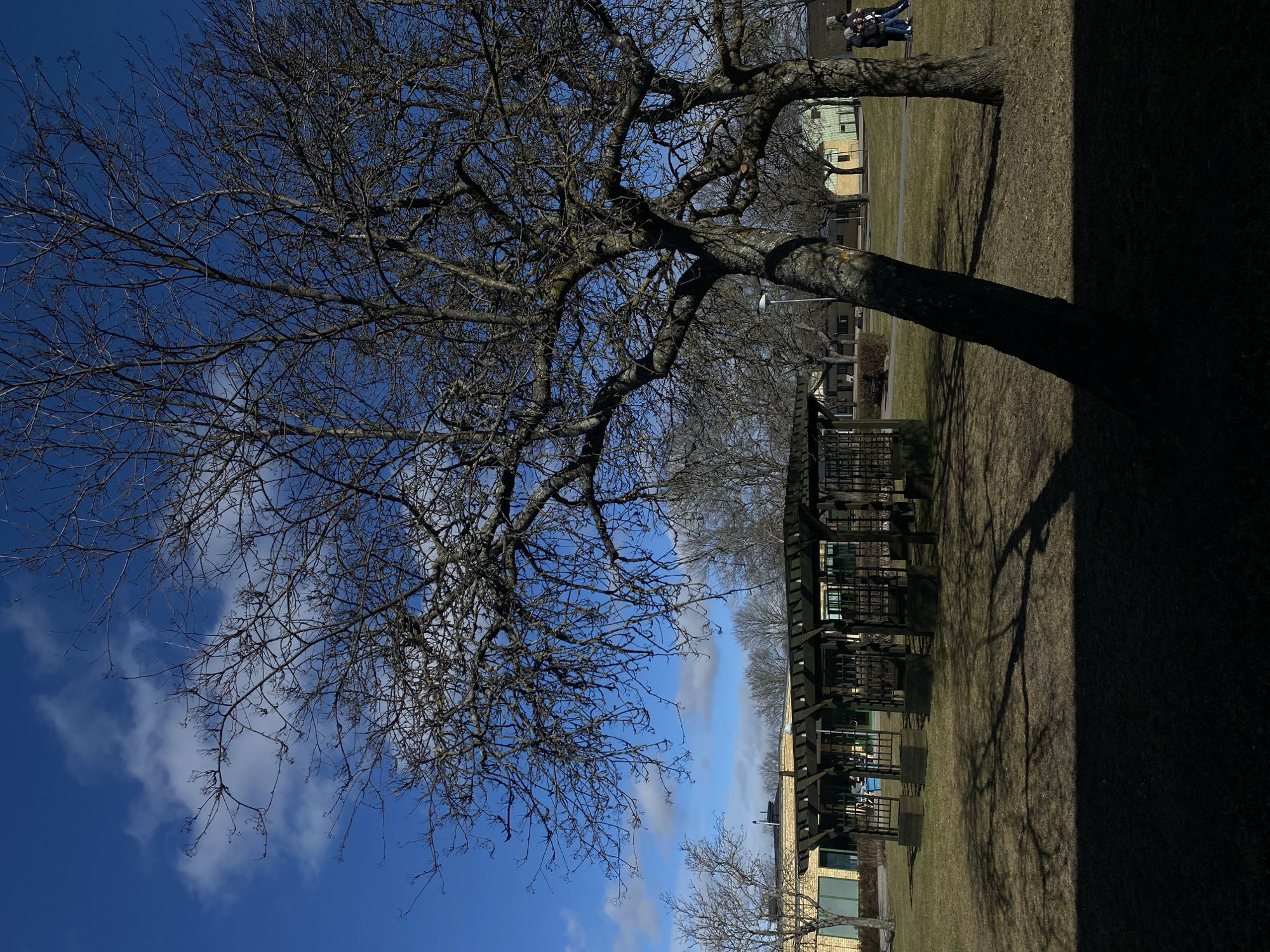 The image depicts a scene at the Stadsparken in Uppsala, Sweden. A large, leafless tree dominates the left side of the frame, its branches reaching up against a blue sky with scattered clouds. To the right, a row of wooden shelters or pavilions stretches into the distance. People are visible near the pavilions in the background. The ground is covered with grass and fallen leaves. The lighting suggests a sunny day, casting long shadows from the tree and pavilions. A couple can be seen on the upper right.