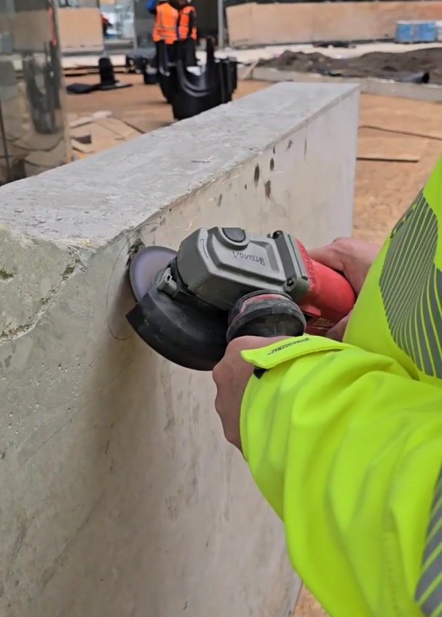 - "A construction worker in a bright yellow safety jacket is using a handheld angle grinder to cut into a concrete barrier" by FM-VT8K93, licensed under CC BY 4.0