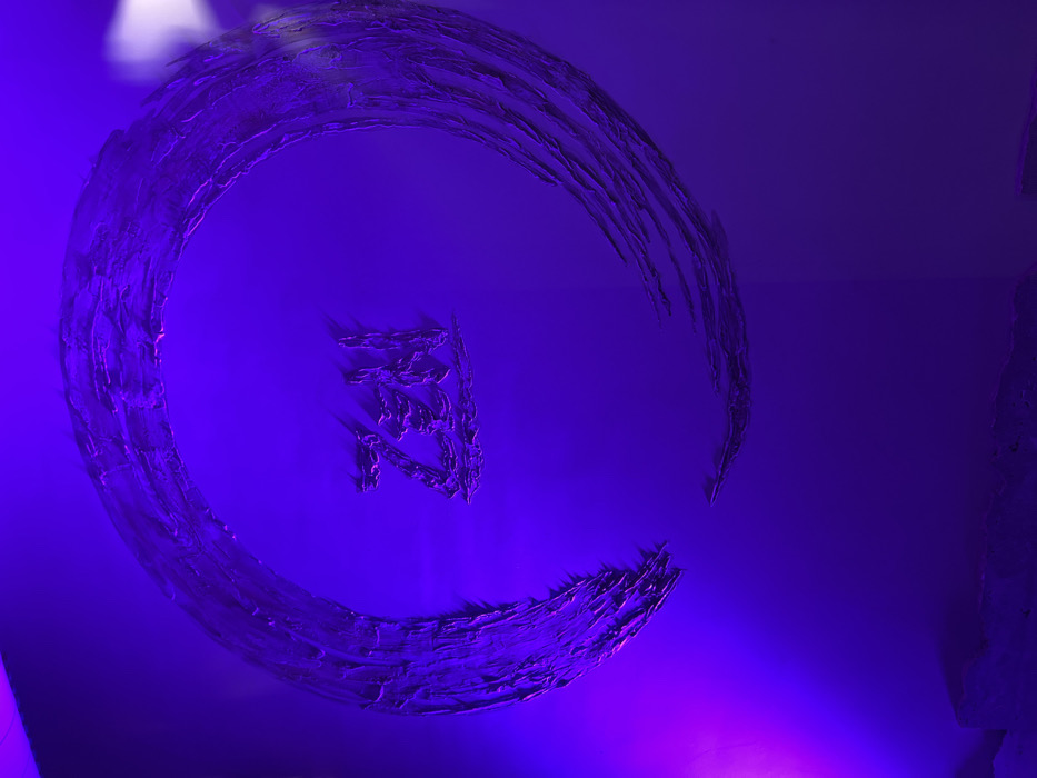 An indoor scene in Yerevan, Armenia, displays a wall-mounted art installation under strong purple ultraviolet lighting. The central subject is a large, incomplete circular form with a coarse, sculpted surface, resembling an Enso. Within this circular element, the word "ZEN" is rendered in textured, sculpted letters. Both the circular form and the text exhibit prominent highlights and shadows, accentuated by the intense purple illumination. The background wall and a visible floor segment in the lower left quadrant are also saturated with this purple light. No individuals or active interactions are present within the frame.