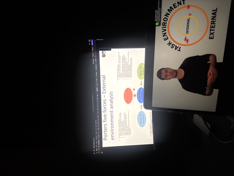 two slides displayed on separate screens. One slide titled "Porters five forces - External environment analysis" illustrates the five forces framework with "Threat of New Entrants," "Bargaining Power of Suppliers," "Rivalry Among Competitors," and "Bargaining Power of Buyers." The other slide shows three concentric circles, labeled as "Internal," "Task Environment," and "External." A person stands beside the "External" circle, looking towards the camera.