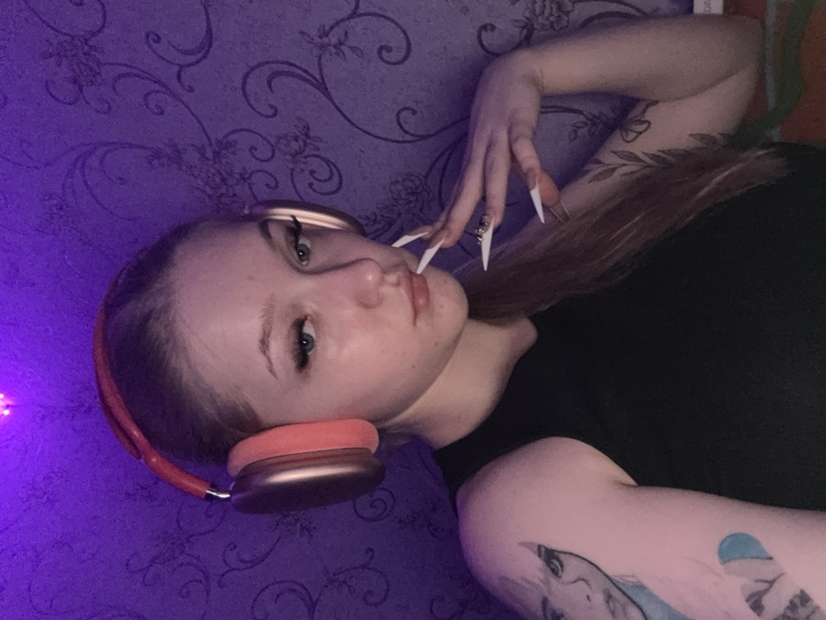 The scene is set in what is identified as Saratov, Russia. A young adult female with light complexion and long, light brown hair, which appears pulled back, is depicted from the chest up, centered in the frame. She wears large, rose gold and coral-pink over-ear headphones. Her eyes are open, and she looks directly at the camera with a neutral expression, enhanced by long artificial eyelashes. Her lips are slightly parted in a pout. She wears a plain black sleeveless top. Her left hand is raised, with the index finger lightly touching her lower lip. She has exceptionally long, sharply pointed white artificial nails (stiletto style) on her left hand, and a ring with small reflective elements is present on her left ring finger. Tattoos are visible on her left arm: an upper arm tattoo featuring a stylized female face with blue elements, and a forearm tattoo depicting leafy branches. The background consists of a wall covered with dark, patterned wallpaper, possibly a floral or damask design. The wall is illuminated by a strong purple ambient light, casting a distinct hue over the scene. A small, bright purple light source is faintly visible at the top edge of the frame. The overall environment is an interior space.