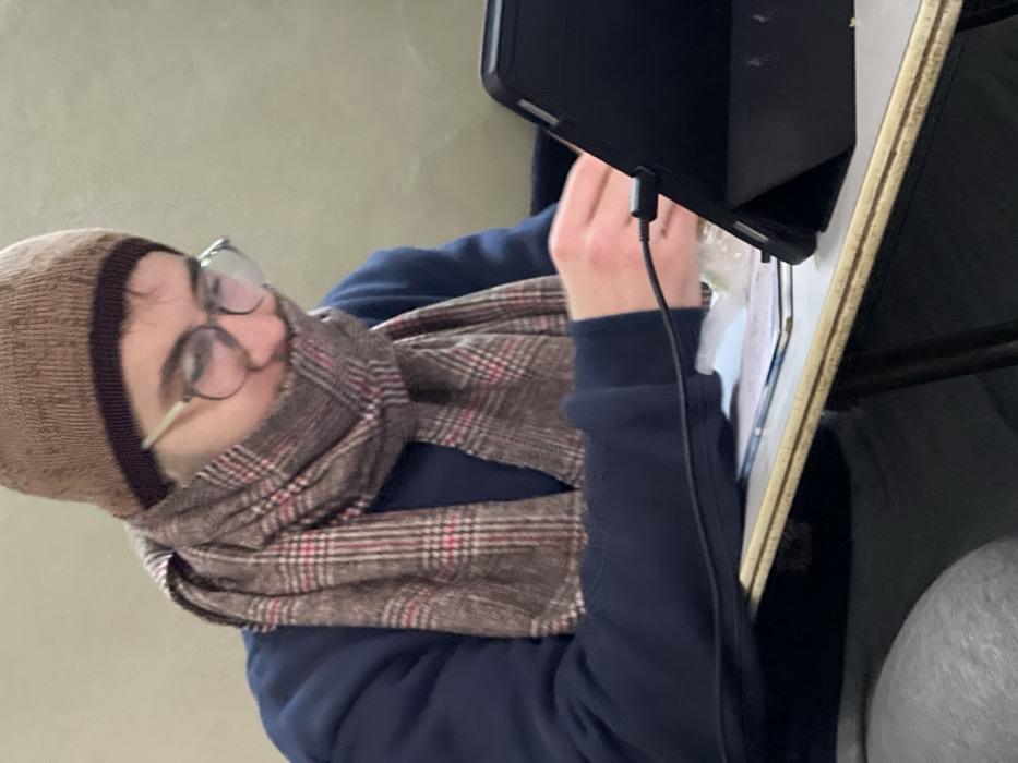 An individual is seated at a light-colored desk in an indoor environment. The person wears a light brown knitted beanie with a dark maroon band, clear-rimmed round spectacles, and a brown, plaid-patterned scarf with red and white accents, which is wrapped around the neck and covers the lower half of the face, including the mouth and nose. The individual is dressed in a dark blue long-sleeved garment and light grey trousers, partially visible. The person is looking downward, with hands positioned above a dark-colored tablet, which is propped upright in a dark case on the desk. A black charging cable is connected to the right side of the tablet. On the desk, to the left of the tablet, are multiple white papers or documents and a small, crumpled white wrapper. The background consists of a plain, light-tan wall. The specific location within the city of Homs, Syria, cannot be determined from the visual information presented in the image.