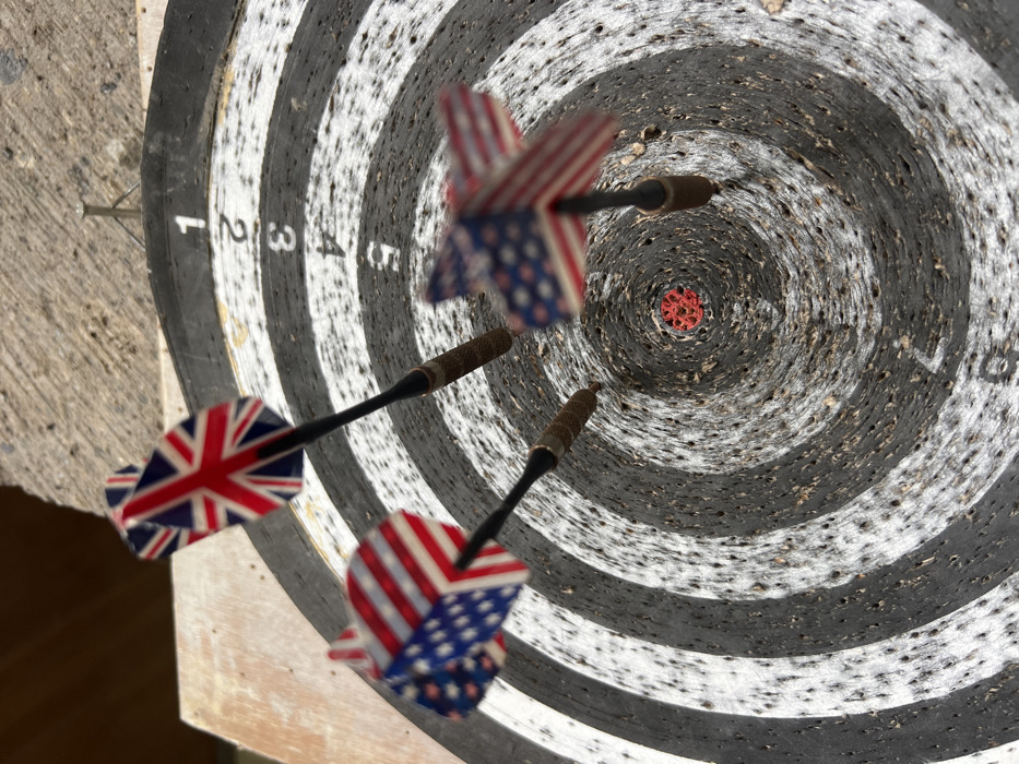 A worn dartboard with black and white concentric circles contains four darts. One dart, adorned with the Union Jack, sits near the "1" mark. Two darts with American flag flights are also visible, one near the board's center and another towards the bottom edge. A fourth dart has landed directly in the bullseye. The board shows considerable wear and tear with numerous holes scattered throughout.