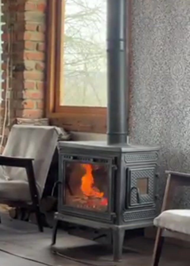 A small black wood-burning stove with a fire burning inside is centrally positioned in the frame
