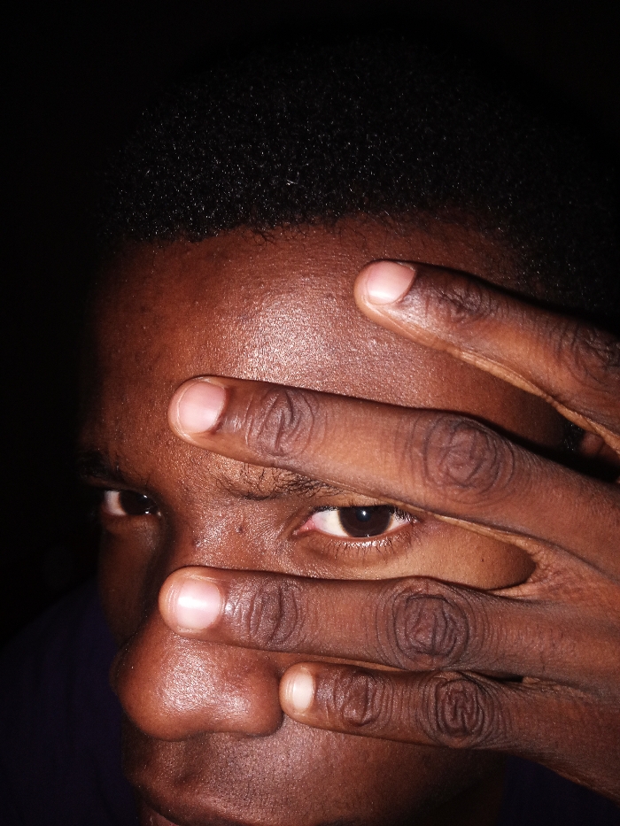 A close-up image reveals a dark-skinned person with short, textured hair. The focus is on the face, specifically the eyes, as the person's hand is partially obscuring the view. The fingers are dark-toned and slightly shiny. The eyes are brown with visible details and appear to be looking directly at the viewer. Lighting is subdued, casting shadows across the face and emphasizing the texture of the skin.