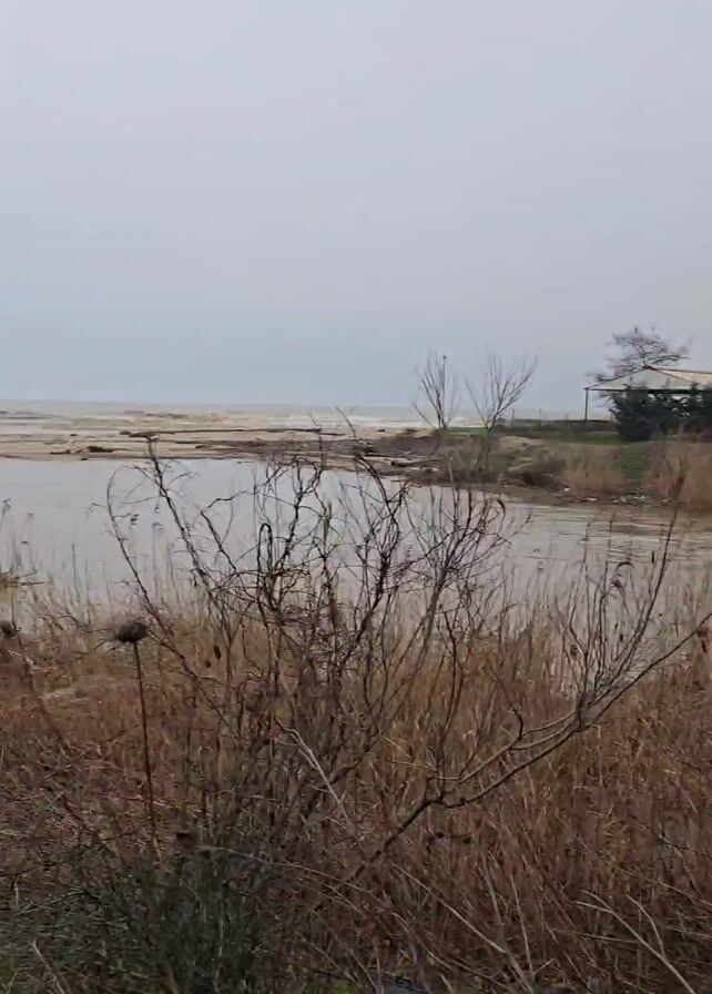 gray, overcast view of the sea through a foreground of tall, brown, dry reeds. The sea appears murky with small waves breaking near the shore. A low, flat, concrete structure is visible in the water near the edge. Beyond the reeds to the left, there is a sandy area. Further in the background, a building with multiple stories can be seen on the right side of the frame. There is no visible motion within the scene except for the movement of the waves.