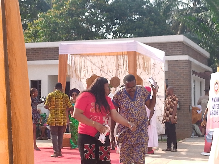 An outdoor scene in Alor, Nigeria, features a gathering of people. In the immediate foreground, a woman with long dark hair wears a red short-sleeved top and a black skirt with a distinct red and black geometric pattern; she holds a white cloth in her right hand and appears to be in motion, facing left. To her right, a man with glasses and a mustache wears a blue and gold patterned V-neck tunic; he is also in motion, facing right, holding a small silver object or book in his raised left hand. Both central figures are on a red carpet. In the mid-ground, multiple individuals are visible. A man in a yellow and black patterned shirt walks away from the viewer on the red carpet. Further back, a woman in green attire is partially obscured. Another man in a brown and tan patterned shirt stands near a building to the right. The background features a single-story building with white walls and brick accents on its upper section. An elaborately decorated structure, possibly an archway or canopy, is positioned in front of the building, draped with white and light orange fabric and featuring hanging decorative elements. Green foliage and trees are visible above and behind the building. On the far right, a vertical banner, partially visible, displays a circular logo and text including "NWAN..." and "UNITED BROTHER...". The scene is illuminated by bright daylight.