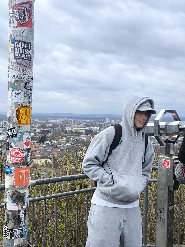 The image depicts an elevated scenic overlook in Freiburg im Breisgau, Germany, offering a panoramic view of the city under an overcast sky. A tall, cylindrical pole, heavily covered with an array of multi-colored stickers, is positioned prominently on the left side, with text and logos visible, including "Freiburg" on one sticker. A dark, two-tiered metal railing with vertical bars spans the lower mid-ground, separating the immediate foreground from the city below. Green buds are visible on the sparse vegetation behind the railing. To the right of the frame, a metallic, hexagonal-topped viewing scope is partially visible. A young individual, appearing male, stands slightly right of the center, facing partially towards the left. He is dressed in a gray hooded sweatshirt with the hood pulled up, a gray cap worn beneath the hood, a white t-shirt visible beneath the sweatshirt, and gray sweatpants. A black backpack with green accents is worn on his back, and white wired earphones are draped around his neck, with hands placed in the front pocket of his sweatshirt. A partial view of a second individual, indicated by a Gucci-patterned item, is present at the extreme right edge of the frame, adjacent to the viewing scope.