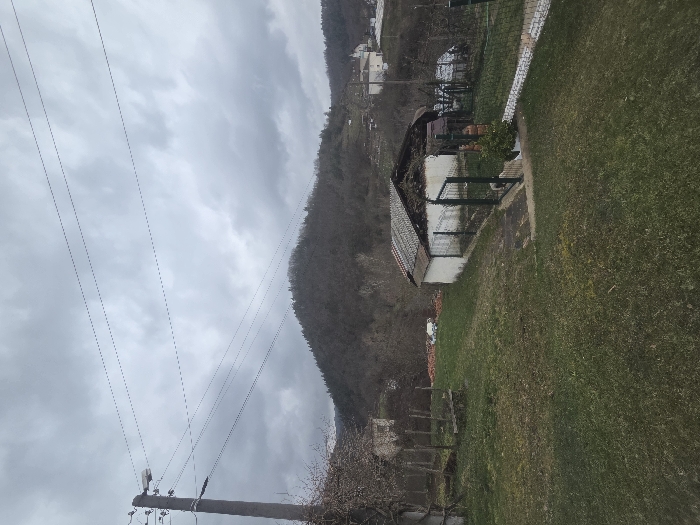 The image depicts a rural or semi-rural landscape in Chorbadjisko, Bulgaria, under an overcast sky. In the immediate foreground, green grass covers a gently sloping terrain, displaying patches of less dense growth. To the left, a concrete utility pole extends vertically, supporting four visible overhead power lines stretching horizontally across the upper portion of the frame. Below the power lines, a deciduous tree with bare branches and nascent buds is situated to the left. A rudimentary wooden structure, possibly a well or raised bed, is visible in the grass near the tree. In the midground, a small, white-walled outbuilding with a corrugated grey roof, appearing somewhat damaged or weathered, is prominent. A dark, open entrance or section is visible on its right side. A dark green metal fence with a gate runs in front of this building, separating it from the grassy area. A concrete path leads from the grass to the gate. A small green bush is located near the gate on the right. Behind the white outbuilding, another structure with a dark, curved roof is partially visible, followed by dense, leafless trees and vegetation. Further left in the midground, beyond the outbuilding, a pile of orange-colored material, possibly stacked lumber or bricks, is present. The background is dominated by a large hill or small mountain covered in bare, deciduous trees. Towards the upper right background, several white buildings and structures are discernible, indicating a distant settlement. The sky is uniformly covered with multiple layers of grey clouds. No individuals are present in the scene.