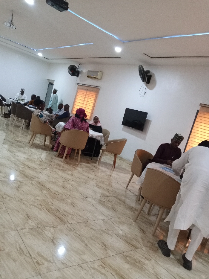gathering of people in a large, modern room. The scene takes place in a banquet hall of a hotel or a restaurant in Yola, Nigeria, at the coordinates 9.198 latitude and 12.491 longitude. The people are seated at several tables, covered in white tablecloths, with tan chairs. They are engaged in conversation. Several ceiling fans are visible, with light fixtures embedded in the white ceiling. Large windows with white blinds are on the right and left sides of the room. The room is furnished with a large television on the wall, and there are beige tile floors. The image is taken from a low angle. There is a person standing at the end of the room with their back to the camera. The person is wearing a white long-sleeved shirt and black pants, their face is not visible. The people at the tables are dressed in traditional Nigerian clothing. The scene has a relaxed and peaceful atmosphere.