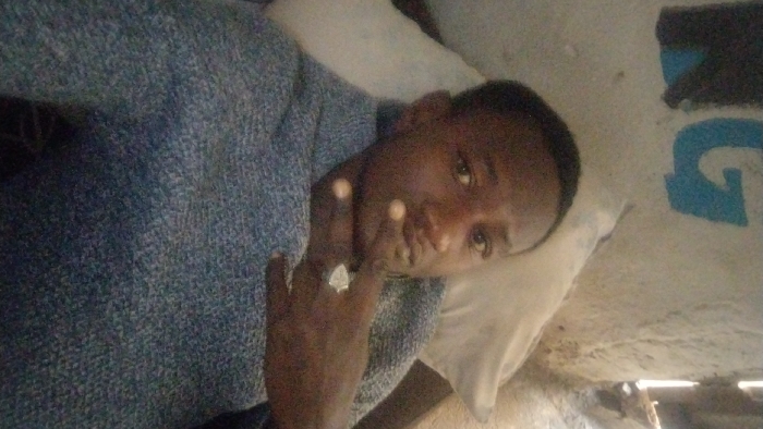 A young adult male with dark skin and short dark hair is depicted in a close-up, selfie-style photograph
