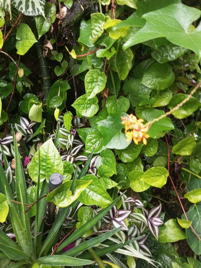 Lush greenery fills the frame, showcasing diverse plant textures and colors. Heart-shaped, glossy green leaves intermingle with striped foliage of white, green, and purple. Elongated, spiky green leaves fan out in the lower portion. A cluster of small yellow flowers adds a touch of color, while a thin bamboo stalk peeks through the dense vegetation. The scene is vibrant and overgrown.