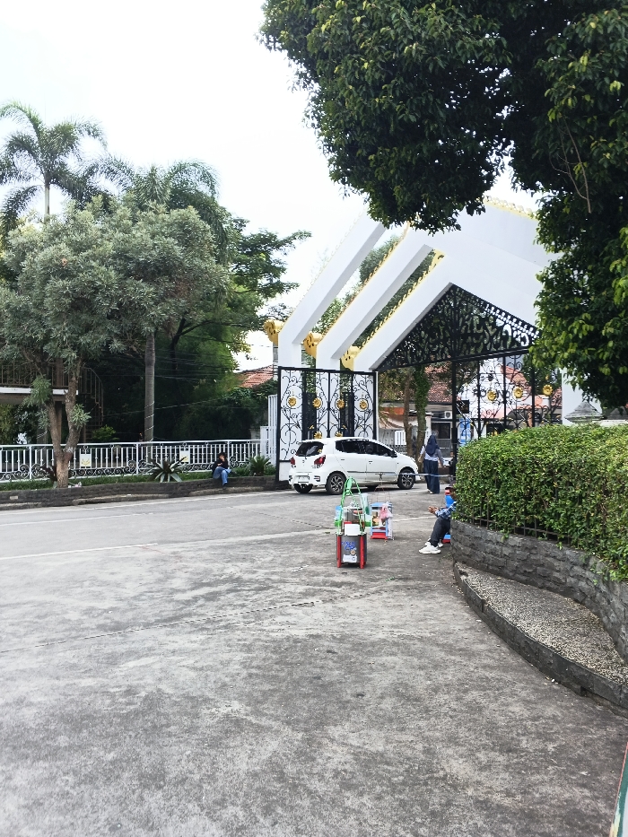 This image presents an outdoor scene in Bien Hoa, Vietnam, under an overcast sky. The foreground consists of a grey concrete surface transitioning into a darker asphalt road that runs horizontally across the frame. In the immediate foreground, to the left of center, two small, wheeled vendor carts are present; one predominantly red, the other green, both displaying various items. To the far right, a person wearing a blue plaid shirt, dark pants, and white sneakers is seated on a low stone wall topped with green hedges. In the midground, a white compact hatchback car is parked facing left on the asphalt road. Behind the vehicle and to its right, a person in a headscarf and dark clothing is observed walking away from an ornate entrance. The entrance features a large, decorative white gate with gold accents and intricate black metal scrollwork, topped by white architectural structures with golden finials. To the left of the road, another individual, dressed in blue jeans, is seated on a raised concrete planter or median strip. The background is characterized by dense green foliage and numerous trees, including tall palm trees on the left. Glimpses of buildings with light-colored walls and dark roofs are visible through the trees and beyond the main gate. A white metal fence or railing runs along a raised area on the far left.