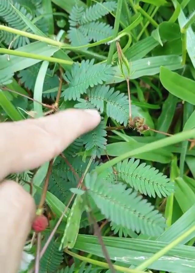 hand touching the leaves of a Mimosa pudica plant, also known as the sensitive plant. The leaves of the plant fold inwards upon being touched. The plant is growing among other grasses and weeds. It has several stems with small, fern-like leaves that fold together when disturbed. There is also a round, fuzzy flower with pink and white coloring, and some red, seed-like pods. The background consists of green grass and other vegetation.