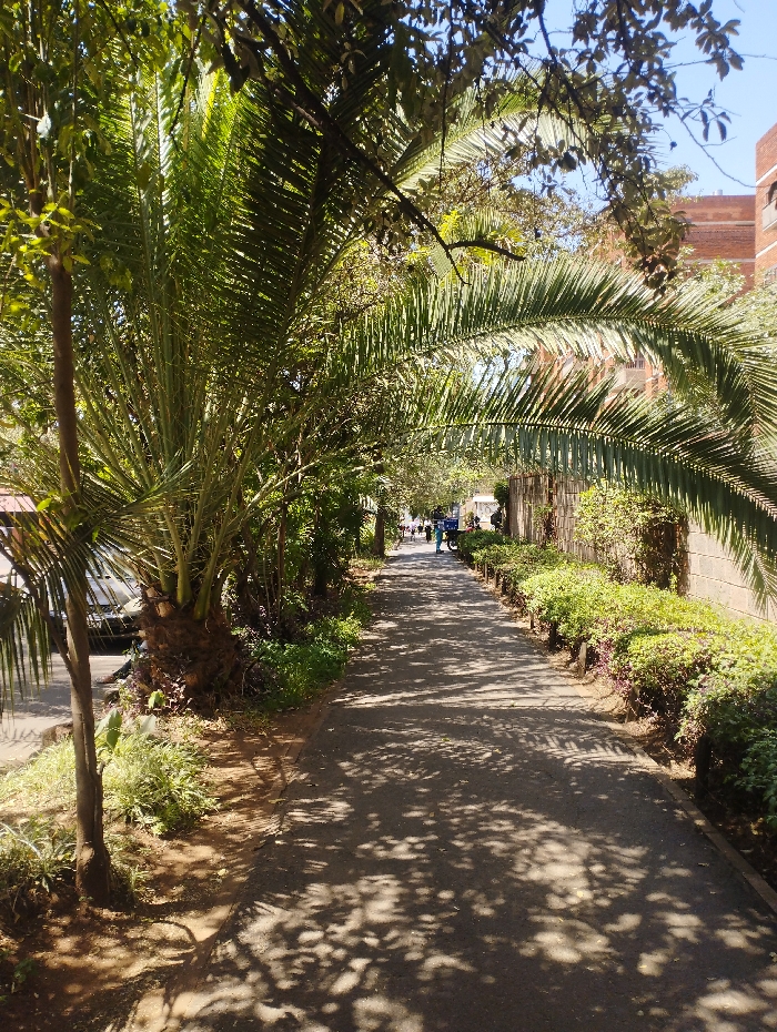 The image displays a tree-lined pedestrian pathway in Nairobi, Kenya, observed under direct sunlight