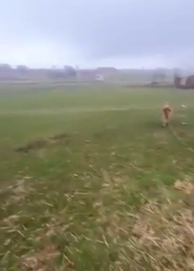 The video depicts a grassy field on a foggy day. A dog initially runs across the field away from the camera. The camera then pans across the field, showing sparse vegetation and a few structures in the distance obscured by the fog. A mound of reddish-brown earth is also visible in the middle of the field. Overhead power lines run across the sky.