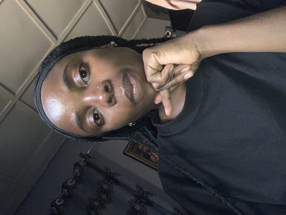 A young, dark-skinned woman with braided hair poses close to the camera. She wears a black headband and a matching black t-shirt. Her hand is raised near her face. A small stud adorns her nose. The background is dimly lit, revealing a picture frame and decorative curtains on a wall. The image appears to be taken indoors, possibly in a bedroom.