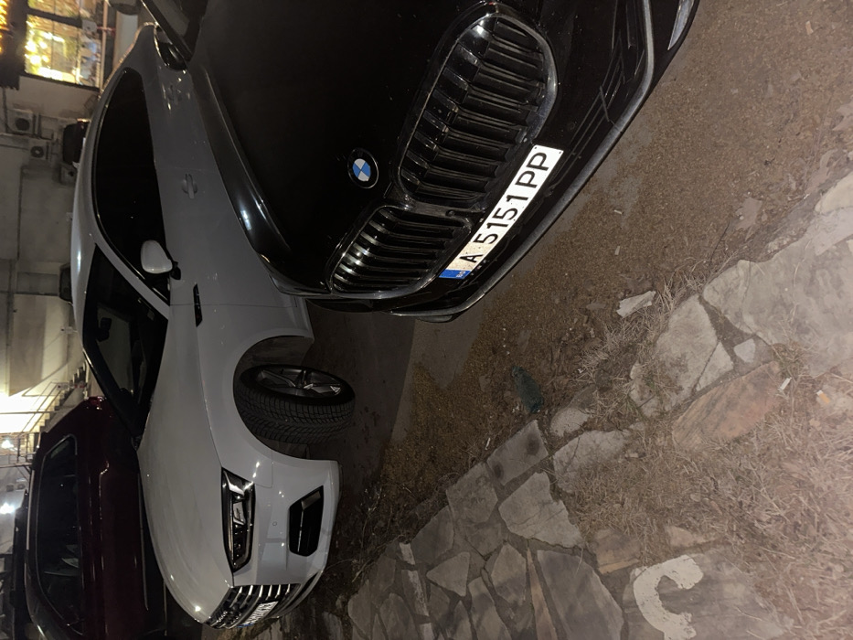 The scene depicts a nighttime urban street or parking area in Montana, Bulgaria, featuring three parked vehicles. In the foreground, the front-right portion of a black BMW is visible, displaying a prominent chrome grille, the BMW emblem, and a Bulgarian license plate "A 5151 PP," which indicates the Montana region. To its left and slightly behind, a white Audi A5 coupe is parked, showing its front-left quarter, including distinctive headlights and a front wheel fitted with a winter tire. Further in the background, a dark red SUV is partially visible behind the white Audi. The ground surface consists of irregular paving stones on the left, bordering a strip of dry earth with sparse vegetation and scattered debris, including a faint white marking on the paving. In the background, an illuminated building facade suggests a commercial establishment, and an external staircase with railings is visible to the left.