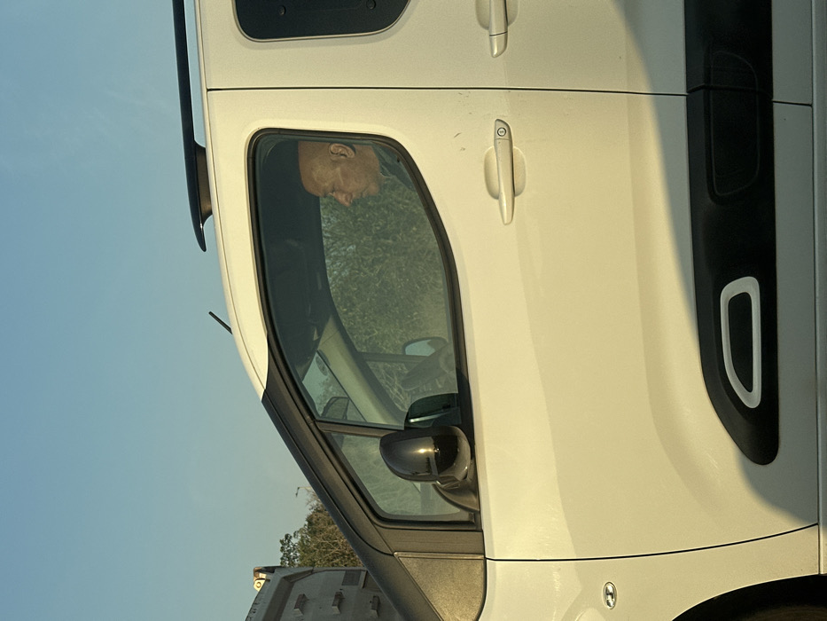 A white utility vehicle is shown, with a balding man visible in the driver's seat. The side door features a silver handle and a black vent design outlined in white. A black side mirror is visible. The sky above is pale blue, and some greenery is visible through the car window. The bottom of the vehicle and a building are visible at the bottom.
