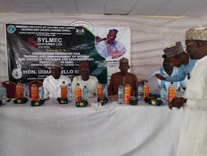 group of men seated at a table in front of a banner in Gombe, Nigeria, located at coordinates 10.294, 11.124. The banner reads "Nigerian Institute of Leather and Science Technology (NILEST) Samaru Zaria. Federal Ministry of Innovation, Science and Technology." There are bottles of water and orange juice on the table. The man on the far right is wearing a white gown, and the other men are dressed in various traditional attire. They appear to be engaged in conversation and appear to be attending a graduation ceremony. The event is being held indoors and the ceiling is made of white canvas material. The table is covered with a white tablecloth and the chairs are wooden with white plastic seats. There are papers and a small electronic device on the table in front of the men. The banner mentions a partnership with Sylmec Ventures Ltd. The image likely captures a moment during a graduation ceremony at the Nigerian Institute of Leather and Science Technology.