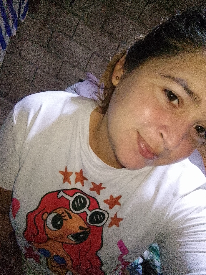 An indoor close-up photograph depicts a female individual in Altagracia, Venezuela. The subject is viewed from the chest up, positioned slightly angled downwards and to the left, looking directly at the camera with a subtle smile. She has dark hair, which is pulled back, revealing a small gold stud earring in her right ear. She is wearing a white short-sleeved t-shirt featuring a large graphic design on the front: a cartoon character with wavy red hair, an orange face, large eyes, and white oval sunglasses on her head, surrounded by several orange five-pointed stars. The background consists of a dark, textured wall, likely constructed from bricks, with visible mortar lines. A blue and white striped fabric is partially visible on the upper left, and a soft, light purple fabric is behind her right shoulder. The image displays visible noise, indicative of dim lighting conditions.