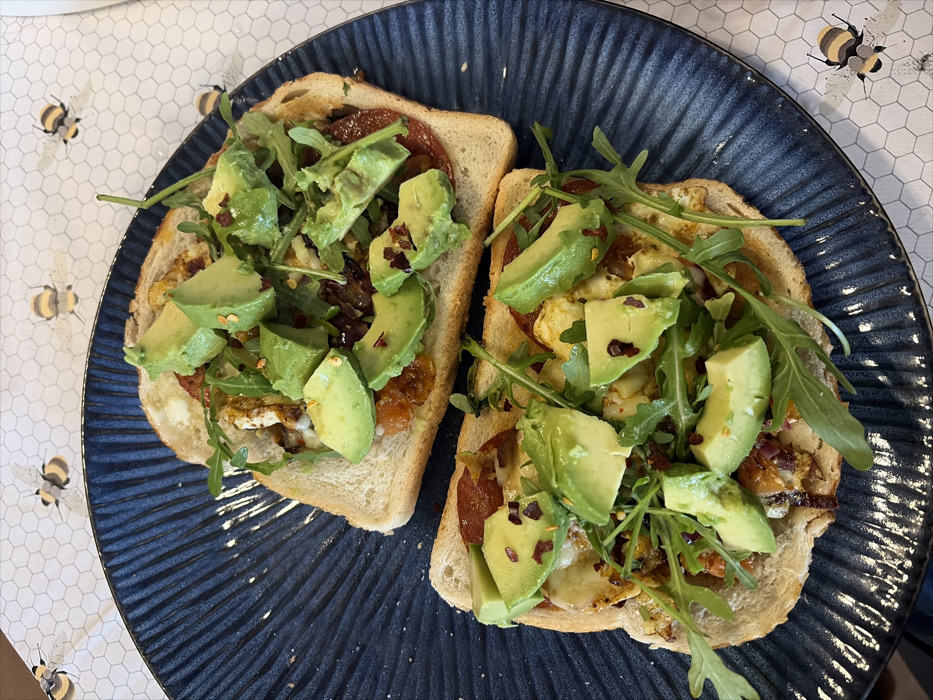 - "The image displays an overhead close-up view of two slices of avocado toast presented on a dark blue ceramic plate, located in an indoor setting, stated to be in New Forest, United Kingdom" by FM-csusO2, licensed under CC BY 4.0