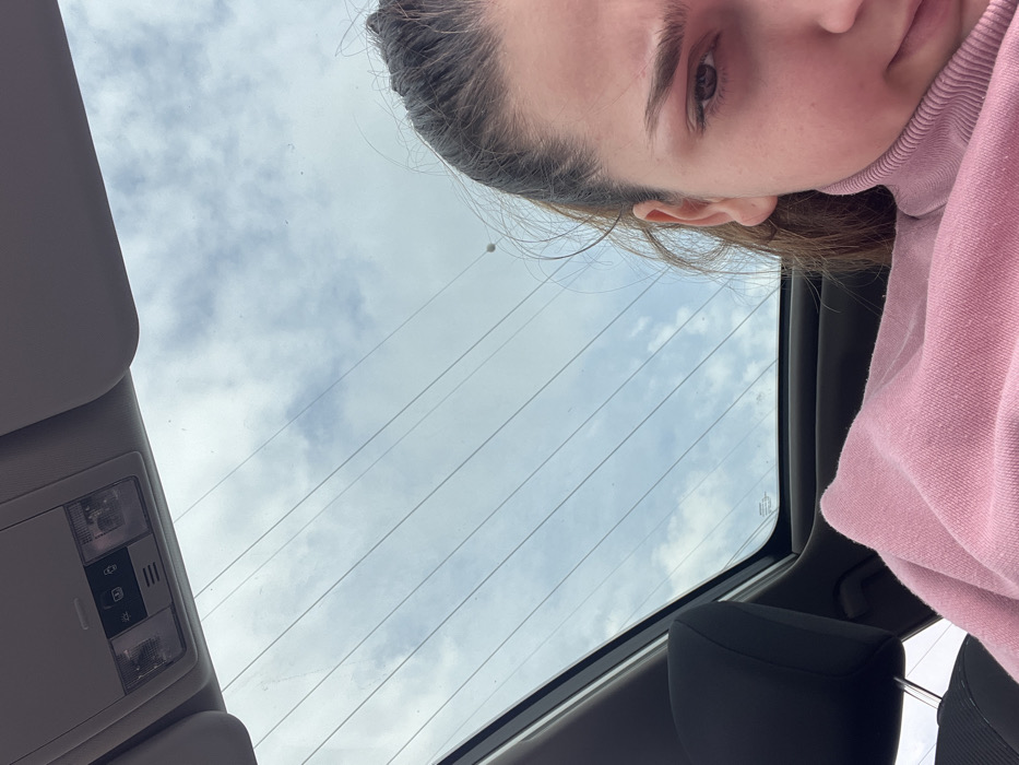 The scene depicts the interior of a vehicle located in Vendenheim, France, captured from a low angle looking upwards and towards the right. A female individual is partially visible in the lower right quadrant, showing the right side of her face, with dark hair pulled back, and her right shoulder encased in a pink garment with a ribbed collar. Above her, a panoramic glass roof or rear window of the vehicle reveals a light blue sky with scattered white clouds. Multiple thin, parallel power lines traverse the sky horizontally, with a small, spherical object (possibly an insulator or marker) visible on one of the lines, positioned slightly above the subject's head. The vehicle's overhead console, featuring two rectangular lights and a central control panel, is visible at the top center, while a black car headrest occupies the lower left corner of the frame.