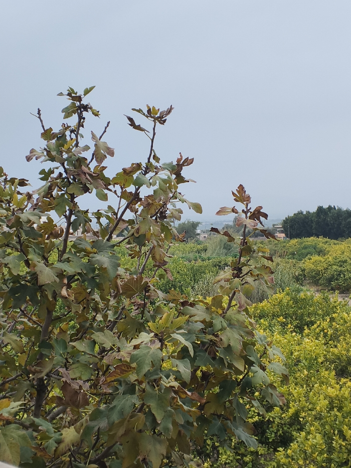 The image displays an outdoor scene in Sheikh Hussein Village, Jordan. The foreground is dominated by the upper branches and foliage of a deciduous tree, consistent with a fig tree, featuring numerous large, lobed leaves in shades of green, some exhibiting brown and yellowish discoloration. Small, dark, round objects identifiable as unripe figs are visible among the leaves. The midground reveals an expansive landscape of varying green and yellowish-green vegetation, suggesting cultivated fields or orchards. In the distant background, under a light gray, overcast sky, faint outlines of buildings or structures are discernible, forming what appears to be a village settlement, with a line of darker trees visible on the right horizon. No individuals or discernible actions are present.