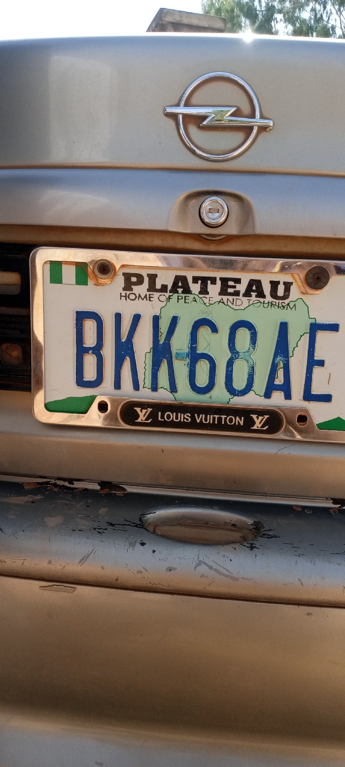A close-up, rear exterior view depicts a light-colored (likely silver or champagne) Opel sedan. The chrome Opel insignia is centrally located on the trunk lid, with a keyhole directly beneath it. A Nigerian license plate, framed in chrome, is affixed below the keyhole. The plate displays "PLATEAU HOME OF PEACE AND TOURISM" and the registration number "BKK 68AE". A black strip on the lower part of the license plate frame features "LOUIS VUITTON" text and "LV" logos in white. The bumper area beneath the license plate shows visible wear, including chipped paint, scratches, and rust. A damaged, oval-shaped silver component, possibly a reflector, is partially embedded in the bumper. The scene is illuminated by bright daylight, with blurry green foliage and structural elements in the background. No individuals or specific actions are depicted. The location is Plateau State, Nigeria; the specific city remains unknown.