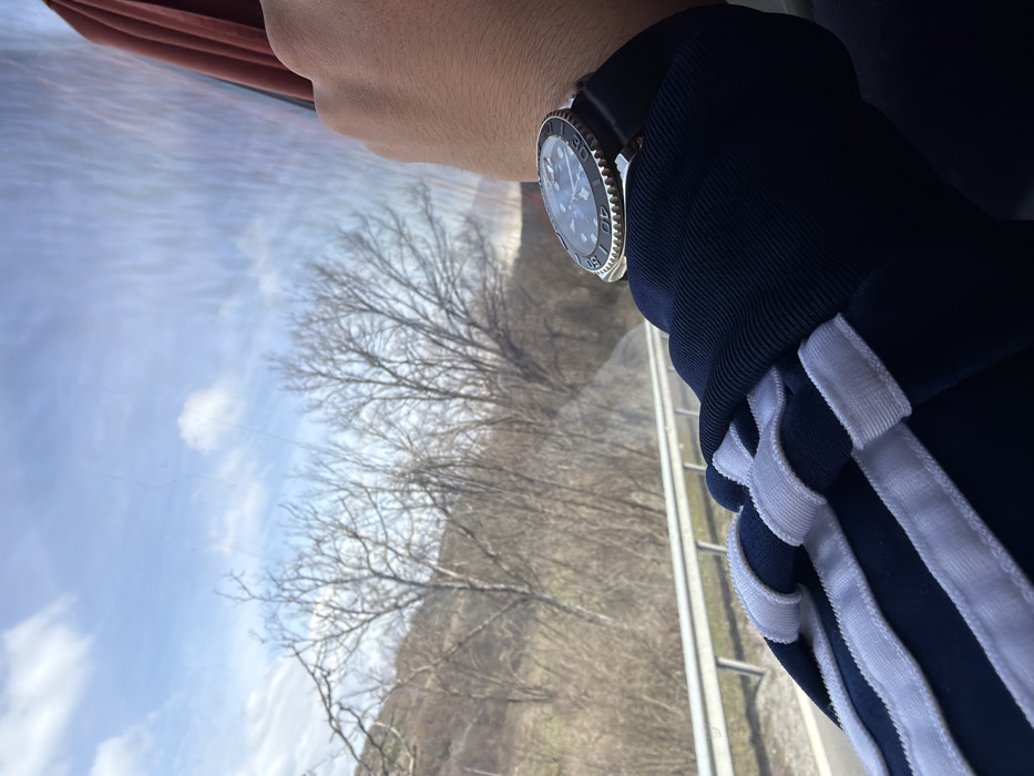 A human left forearm, clad in a dark blue garment with three white stripes, is positioned against a vehicle window. A wristwatch with a black face, silver-toned bezel, and black strap is present on the wrist. A reddish-brown curtain is partially visible on the far right. Outside the window, a metal highway guardrail is visible. Beyond the guardrail, a hilly landscape features numerous bare deciduous trees, suggesting late winter or early spring. The sky overhead is light blue with scattered white clouds. This scene is located in the city of Simitli, Bulgaria.