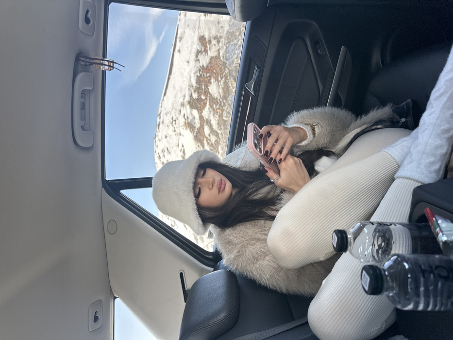 A female individual is seated in the rear passenger seat of a vehicle, in what is identified as the city of Jraber, Armenia. She is wearing a white faux fur bucket hat, a light-colored shaggy faux fur coat, and ribbed off-white leggings. Her dark hair is visible beneath the hat, and her fingernails are painted dark red. She is holding a light pink-cased smartphone in both hands and looking down at its screen. Two clear plastic water bottles are visible in a cup holder in the foreground. Sunglasses are hanging from a passenger grab handle above the right rear window. Through the vehicle's windows, a snow-covered, rocky landscape under a clear blue sky is visible, indicating a cold, bright environment.