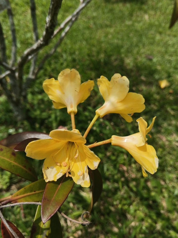 The scene depicts a close-up of a cluster of four vibrant yellow, bell-shaped flowers, indicative of a rhododendron or similar species, situated in Bagochen Boolingpang Ueling, Bhutan. The flowers, suspended from individual short stems, exhibit bright yellow petals, with the lower-most flower displaying prominent orange-yellow stamens within its open bloom, along with lighter yellow or white variegation on some petals. Dark green to reddish-brown, elongated leaves with minor blemishes are visible beneath and to the left of the flower cluster. The immediate background consists of blurred, verdant green grass, suggesting an outdoor environment such as a garden or natural landscape. Further in the background on the left, an out-of-focus, gnarled tree trunk or branches with grayish bark is discernible. The lighting is natural and bright, illuminating the subjects evenly. No human subjects, actions, or direct interactions are present.