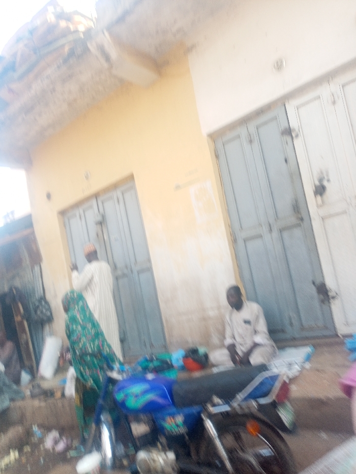 The image depicts an outdoor urban scene in Arawa, Nigeria. A light yellow single-story building with multiple weathered, light grey wooden double doors forms the background. The ground is unpaved and appears dirty, with various small items scattered. Three individuals are present. On the left, a person wearing a light-colored long garment and a cap stands with their back to the viewer, positioned near a closed door. In the center, a person wearing a dark green and blue patterned garment is positioned adjacent to a blue motorcycle. To the right, a male individual in light-colored attire is seated on a mat on the ground, looking towards the camera. A blue motorcycle with green and black accents on its fuel tank is parked diagonally in the foreground. It features a black seat, chrome components, and a red helmet resting on its rear. To the far left, a structure constructed from corrugated metal sheeting is partially visible behind the standing individual.