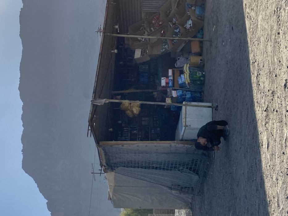 This image depicts an outdoor general store structure in Deh Sabzi, Afghanistan, set against a backdrop of a hazy mountain range under a clear sky. The store, constructed with a corrugated metal roof, features an open front supported by wooden poles. Its left side is enclosed by a light-colored tarp, secured by a roll of wire mesh fencing. The right side is made of corrugated metal. Inside the store, shelves are stocked with various items, including bottles, packages, and bags. Several bare lightbulbs hang from the roof structure. A white chest freezer is positioned towards the left front of the store, and stacks of bottled water, yellow jerry cans, and various goods in cardboard box displays are arranged on the right. A white cloth hangs from a support pole at the entrance. In the foreground, on the dry, dusty ground, a single male individual is observed crouching. He wears dark clothing and appears to be focused downwards, possibly interacting with an object in his hands. No other individuals are present or interacting with him. Power lines are visible in the upper background, behind the store structure. To the far left, beyond the store, outlines of other structures or materials are faintly visible. The overall environment is arid and sparsely developed.