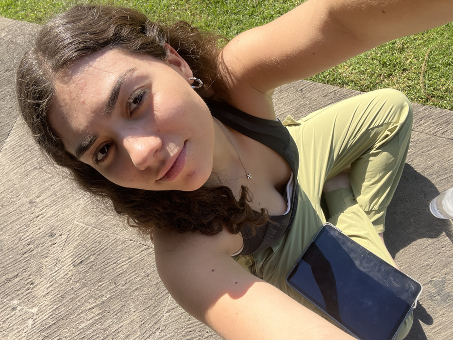 A young woman takes a selfie outdoors, sitting cross-legged on a stone surface. She is wearing a dark tank top with a light-colored garment visible underneath, light green pants, and hoop earrings. A silver necklace adorns her neck. She holds a tablet in her lap. The background includes green grass and a bottle of water. Sunlight illuminates her face and arm, creating shadows on the stone. Her curly hair is tousled and partially obscures her left shoulder.