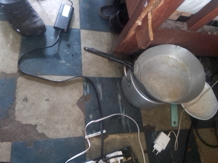scene inside a dwelling in Kajola, Nigeria, located at coordinates 7.517 latitude and 4.519 longitude. There are two metal cooking pots, one nested inside the other, on the floor. Next to the pots is a black power adapter plugged into an electrical outlet on the wall. A black electrical cord runs from the power adapter across the floor to a black power brick on the floor. Another electrical cord runs from the power brick, along the wall, to an unidentified object. In the upper right corner of the image, there is a wooden chair with a white cushion. There is a shoe on the floor in the upper left corner of the image. The floor is covered with a tiled surface with alternating dark blue and light gray squares. The tile surface is cracked and stained. There are several unidentified objects and cords visible on the floor.