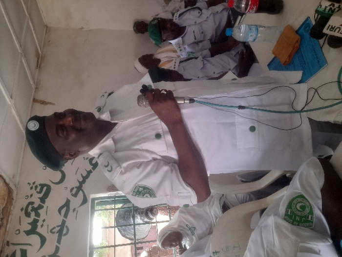 A man in a white uniform and green beret holds a microphone in his hand, addressing a group of people. The uniform has a circular patch with Arabic script and a crescent moon. Some individuals are seated in the background, also wearing similar uniforms. There are water bottles, a Coca-Cola bottle, and notebooks on the table. Arabic script is visible on the wall.