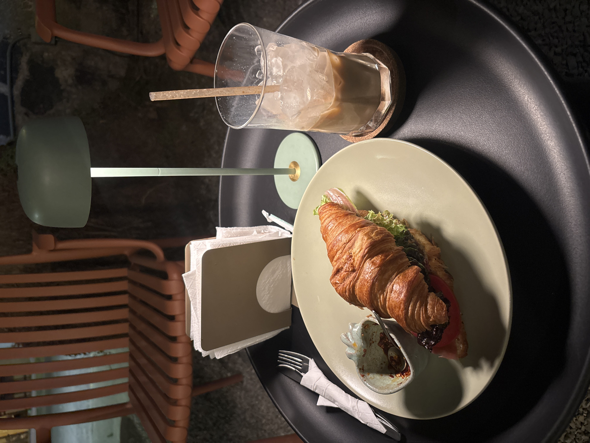 This image depicts a meal set on a dark, circular table in a dimly lit environment, likely an outdoor or semi-outdoor cafe in San Andrés Cholula, Mexico. In the foreground, a large, golden-brown croissant sandwich filled with green lettuce, red tomato slices, and a pinkish meat (possibly ham) rests on a light green ceramic plate. To the left of the croissant, a small, light blue ceramic dish with a textured edge holds a red condiment, possibly chili oil or flakes, with a small silver spoon inside. A silver fork is wrapped in a white paper napkin and positioned to the left of the plate. To the right of the plate, a tall, mint-green table lamp with a dark green domed shade illuminates the table. Further to the right, a clear glass contains an iced coffee or similar beverage, showing distinct layers of liquid and numerous ice cubes, with a single brown straw inserted. This glass sits on a round, textured cork coaster. Behind the plate and lamp, a light brown napkin dispenser holds several white paper napkins. The background reveals a textured, dark wall, possibly stone or concrete. Two burnt-orange, slatted chairs are visible: one partially obscured on the far left, and another, less distinct, on the far right. The ground surface beneath the table appears dark and textured. No individuals are present in the frame, and no specific actions or interactions are occurring.