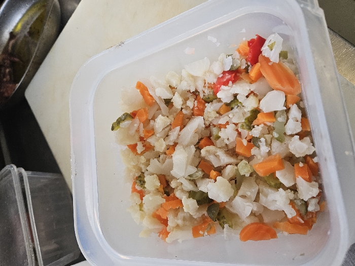 - "This image depicts a clear, rectangular plastic food storage container filled with a mixture of diced vegetables, observed in a food preparation area in Cascais, Portugal" by FM-yfXT73, licensed under CC BY 4.0