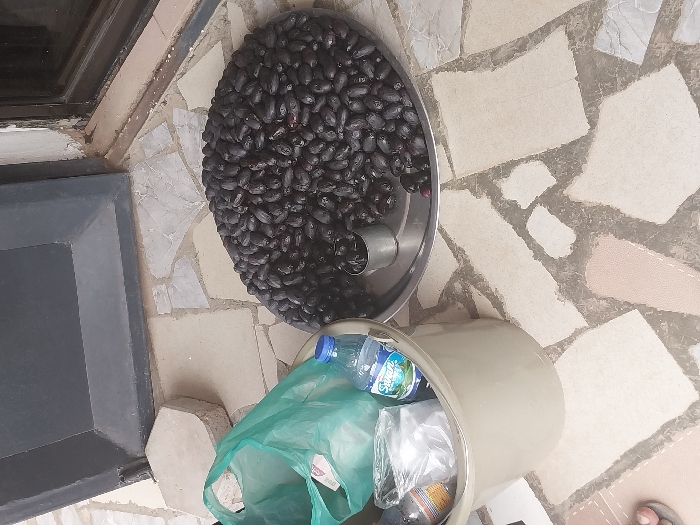 The image presents a ground-level scene in Gura Top, Nigeria. A large, circular metallic tray, filled with numerous dark purple to black, oval-shaped fruits (likely African pears), rests on an irregularly tiled surface. A small, cylindrical metallic cup is positioned among the fruits in the tray. To the left of the tray, a light brown plastic bucket contains a light green plastic bag, a clear plastic bottle of "Swan" brand water with a blue cap, a clear plastic bag filled with smaller clear plastic bags, and a small dark bottle with an orange label. The background features a dark-colored doorway or window frame. The ground is paved with irregularly shaped tiles or flagstones in shades of beige, off-white, and light brown. A partial view of a human foot, wearing a dark sandal, is visible in the lower left corner.