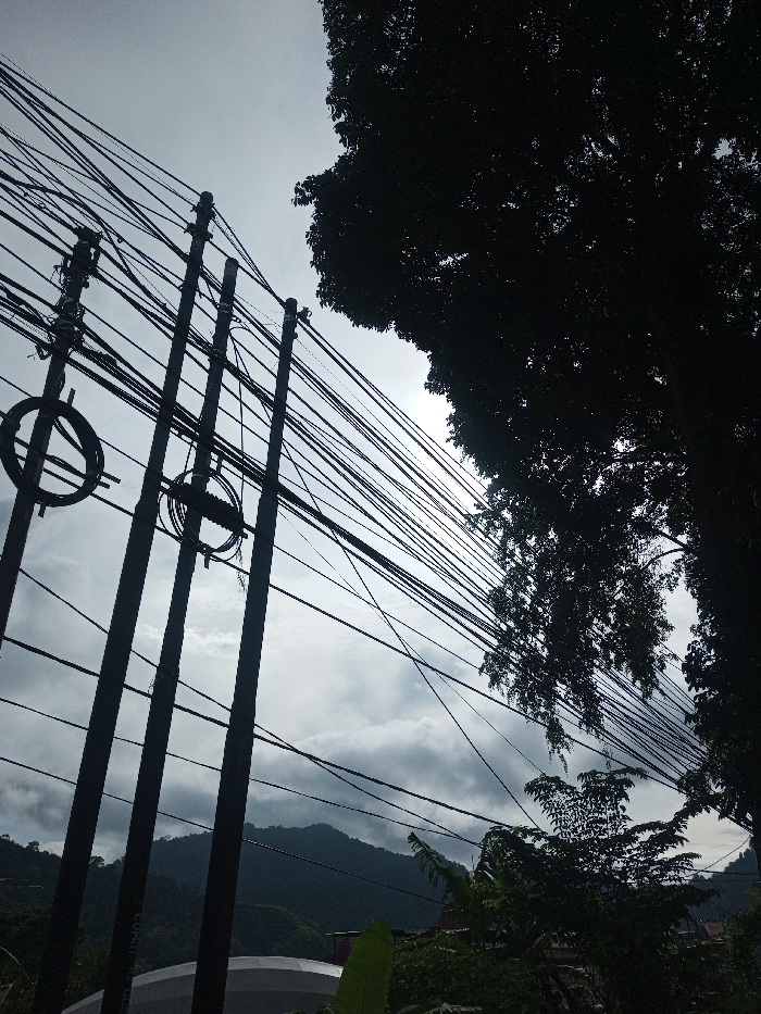 Overhead power lines dominate the view against a cloudy sky. Several utility poles stand tall, intertwined with a dense web of black wires. A large tree with dark, silhouetted foliage fills the right side. In the background, a mountain ridge appears faintly through the overcast sky, adding depth to the scene. Green foliage peeks through at the bottom of the frame.