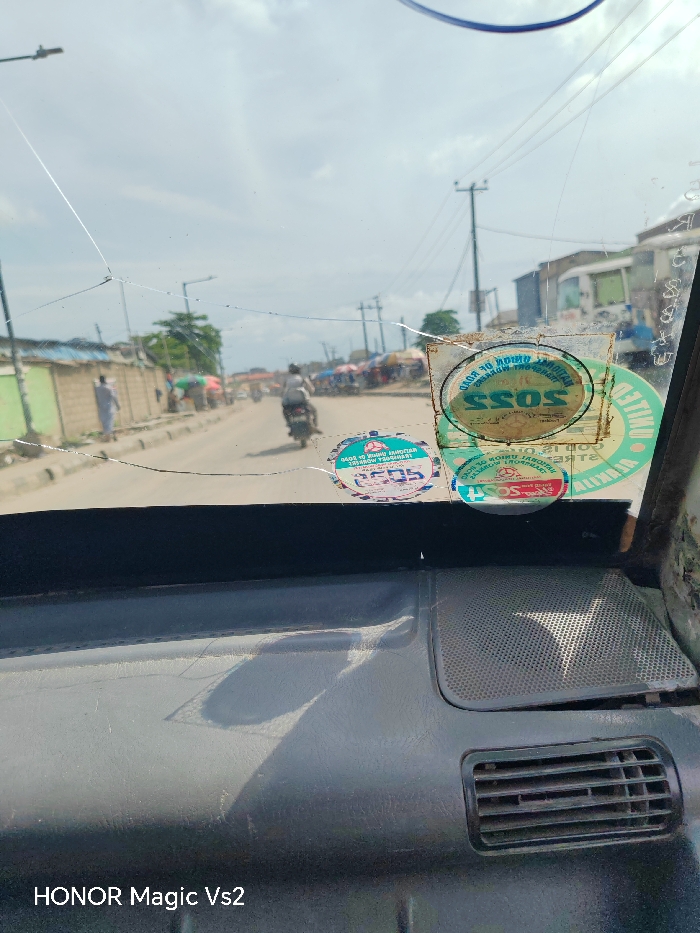 The image depicts a forward-facing view from inside a vehicle, located in Satellite Town, Nigeria, looking out through a cracked windshield