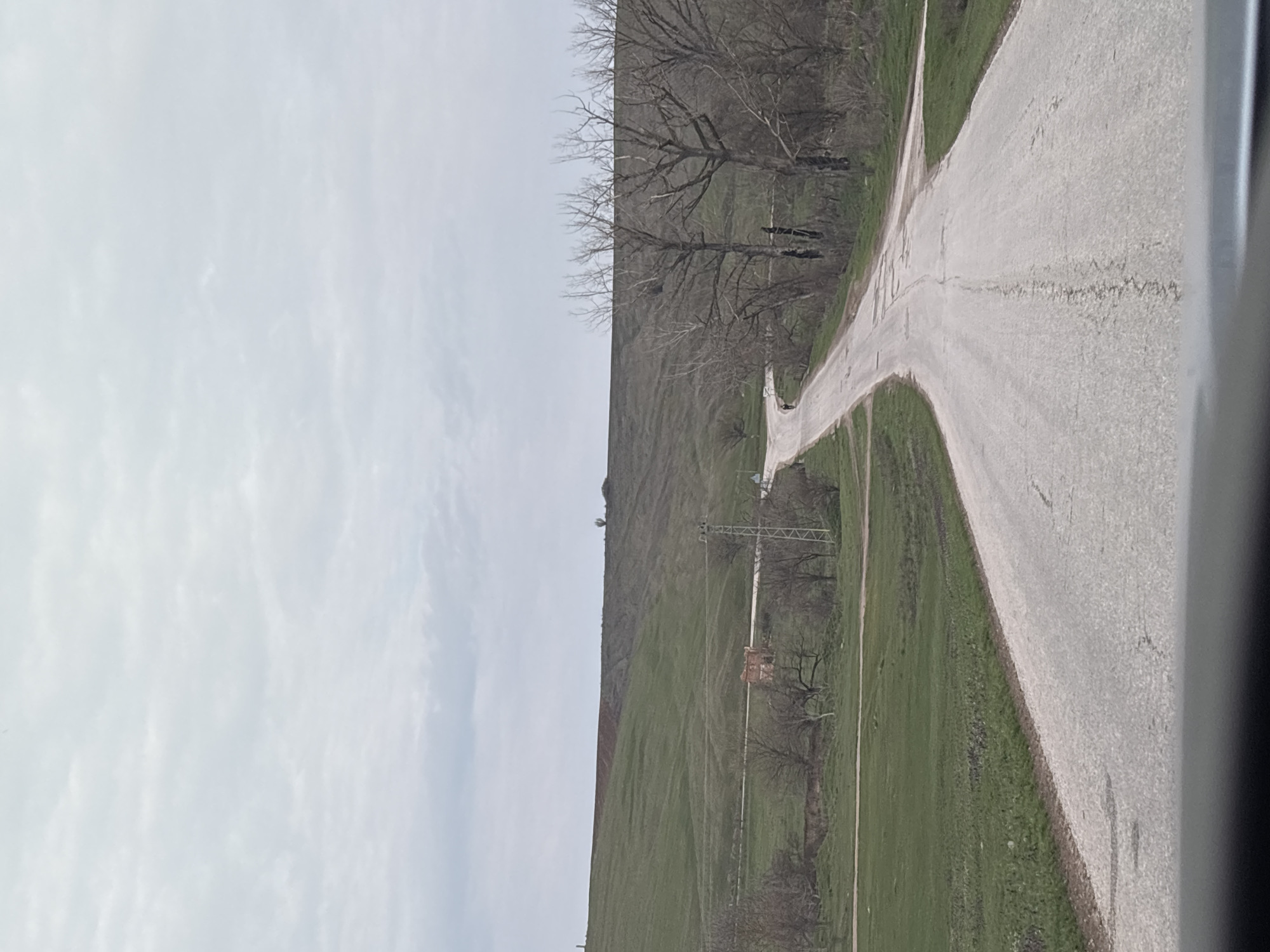 The image depicts a rural road scene in Suhache, Bulgaria, under an overcast sky. A cracked and worn asphalt road, viewed from a low perspective consistent with being inside a vehicle (dashboard visible at the bottom), extends into the mid-ground where it curves to the left and appears to fork, with another path branching right. To the left of the road, green grassy fields ascend towards rolling hills. A small, dilapidated brick structure with an exposed roof is visible in the mid-distance within the fields on the left. Further up the hill, patches of exposed brown earth are present. A single individual, a pedestrian dressed in dark clothing, walks away from the camera on the left side of the asphalt road, near the curve. To the right of the road, a line of leafless deciduous trees with dark bark borders the path, some appearing charred. A metal lattice utility pole with attached power lines stands on the right side of the road, approximately mid-frame. Distant, bare trees and a lone sapling are visible on the horizon of the hills. The sky is uniformly light gray with diffused cloud cover.