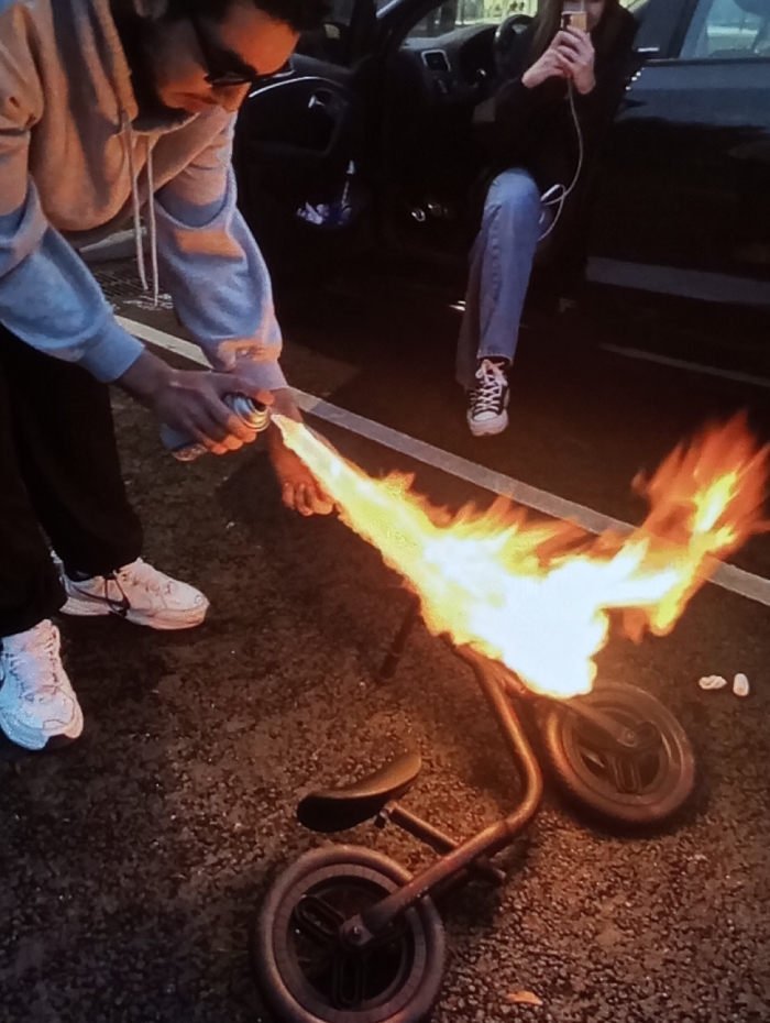 The scene takes place outdoors on a dark paved surface, possibly a street or parking lot, in Riga, Latvia. A male individual, positioned in the foreground, is actively directing a sustained stream of fire from a silver aerosol can towards a small, dark-colored child's tricycle. The tricycle is lying on its side on the ground and is largely engulfed in bright orange and yellow flames. The male wears a light-colored hoodie, dark pants, and white athletic shoes with dark accents; his face is partially obscured by sunglasses and shadow. In the mid-ground, to the right, a female individual is partially visible, seated inside a dark-colored vehicle with the passenger door open. She is holding a white smartphone with both hands, aimed towards the burning tricycle, appearing to record the event. She wears a dark top, blue jeans, and black and white high-top sneakers. A white line marking is present on the dark ground surface, running horizontally across the lower portion of the image. Two small, white, irregular objects are visible on the ground near the burning tricycle.