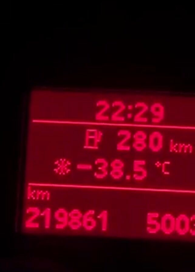 close-up of a car's digital dashboard display. The time is 22:29. The fuel indicator shows the car can travel 280 km on the remaining fuel. The outside temperature is -38.5°C. The odometer reads 219861 km. The car's speedometer is also visible at the bottom of the frame. The display is illuminated in red.