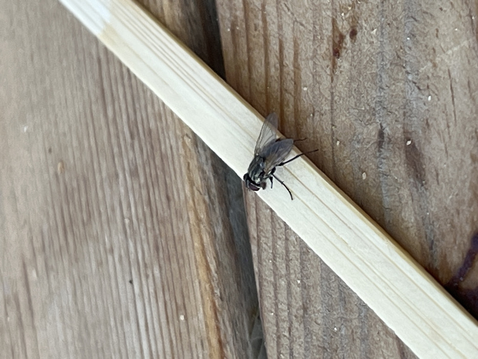 - "In Kfar Ruth, Israel, a single dark-bodied fly, exhibiting prominent red eyes and translucent wings, is positioned on a light-colored, rectangular wooden stick" by FM-iEctz2, licensed under CC BY 4.0