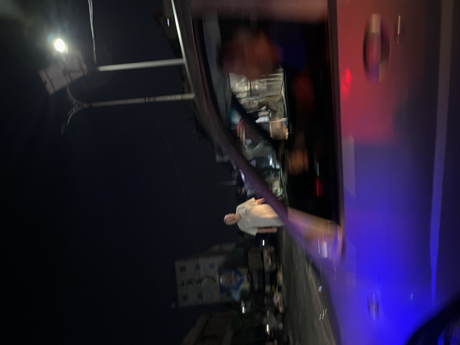 The image captures an urban street scene at night in Sarouja Municipality, Syria, from the perspective of a moving vehicle. The foreground features the left side of a light-colored vehicle, likely a car, exhibiting motion blur and reflecting prominent blue and red light. A blurred individual in a dark shirt, presumably the driver, is visible through the driver's side window. In the midground, an adult male is standing on what appears to be a paved street or sidewalk. He is wearing a light-colored short-sleeved shirt and light trousers, illuminated by ambient light. His face is visible and oriented towards the left. Behind him, indistinct figures and objects suggest other people and street activity. The background on the left includes a multi-story, light-colored building. Below it, at street level, are blurred elements consistent with market stalls or street refuse. A large, indistinct banner or mural featuring blue and yellow colors is visible. On the right, a streetlight pole with two luminaires provides overhead illumination against the dark night sky.