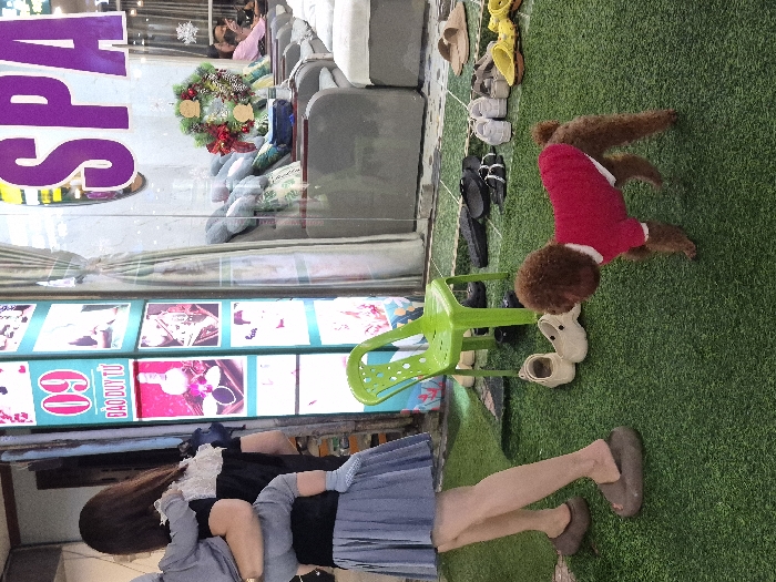 This image captures the entrance area of a spa located on Đào Duy Từ street in Hội An, Vietnam. The ground is covered with artificial green turf. In the left foreground, a woman with dark hair, wearing a black top with white lace trim, a pleated light blue skirt, and dark brown flat sandals, is seen from behind carrying an infant dressed in a light grey long-sleeved romper and light blue socks. To the woman's right, a bright green plastic chair is placed on the turf. In the middle ground, a small, reddish-brown poodle-type dog, wearing a red shirt with white collar and cuffs, stands on the turf, facing right. Various pairs of footwear, including beige clogs, black slides, white sneakers, yellow clogs, and brown sandals, are scattered on the turf. The background features a glass storefront of a spa, marked by large purple "SPA" lettering on the window. Inside, several individuals are seated in grey massage chairs with patterned pillows. A festive Christmas wreath with red and green decorations hangs on the window, and a blue basin is visible near one of the chairs inside.
