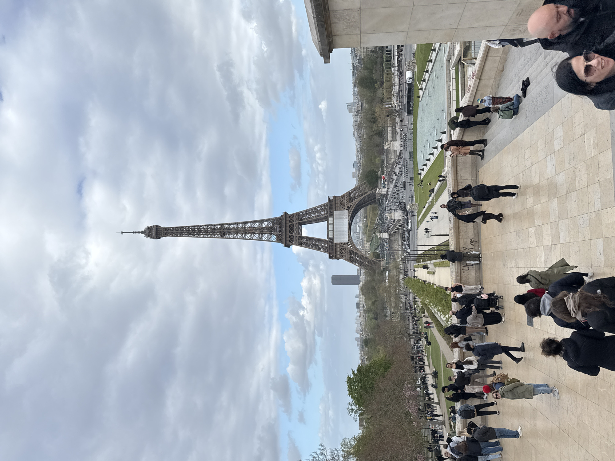 view of the Eiffel Tower in Paris, France. The tower stands prominently against a sky filled with clouds. A building is visible in the upper right corner, partially obscuring the scene. In the foreground, people are observed standing and sitting on a paved area, some near a fountain. Trees and greenery are visible in the midground. The scene is captured from an elevated position, overlooking the Champ de Mars.